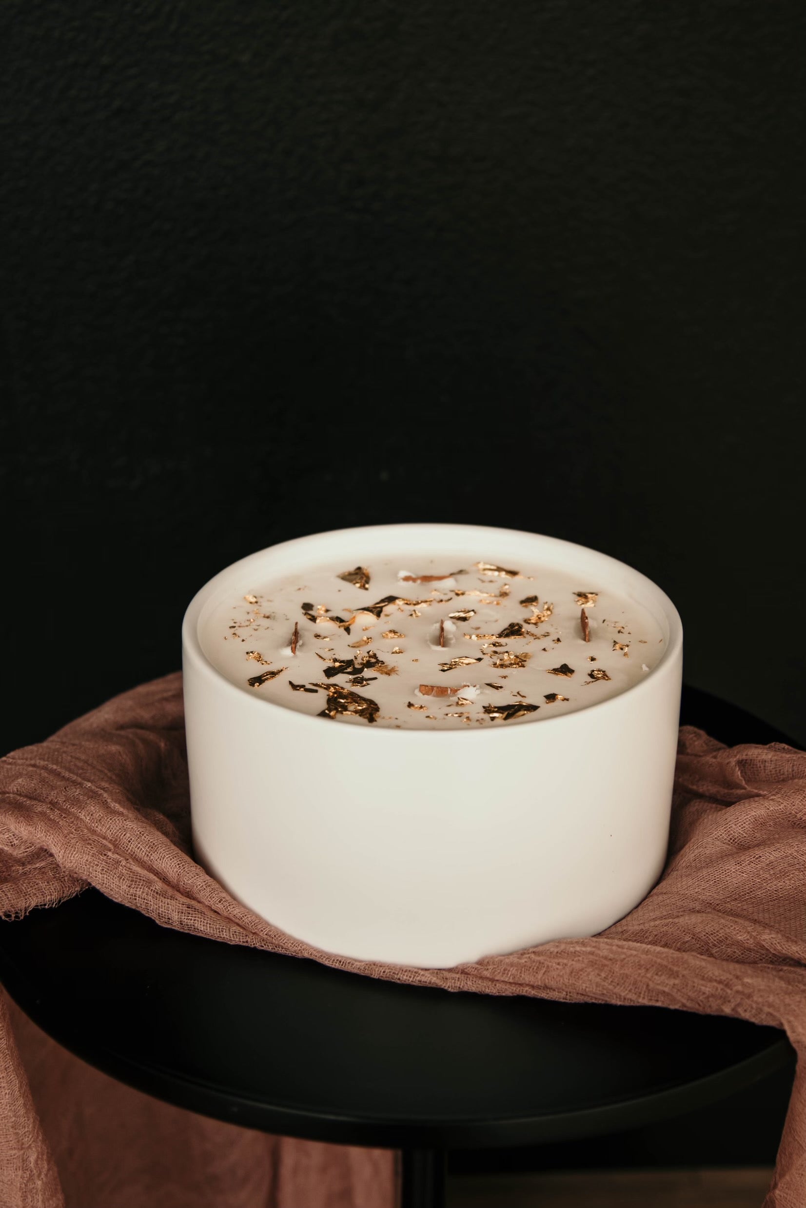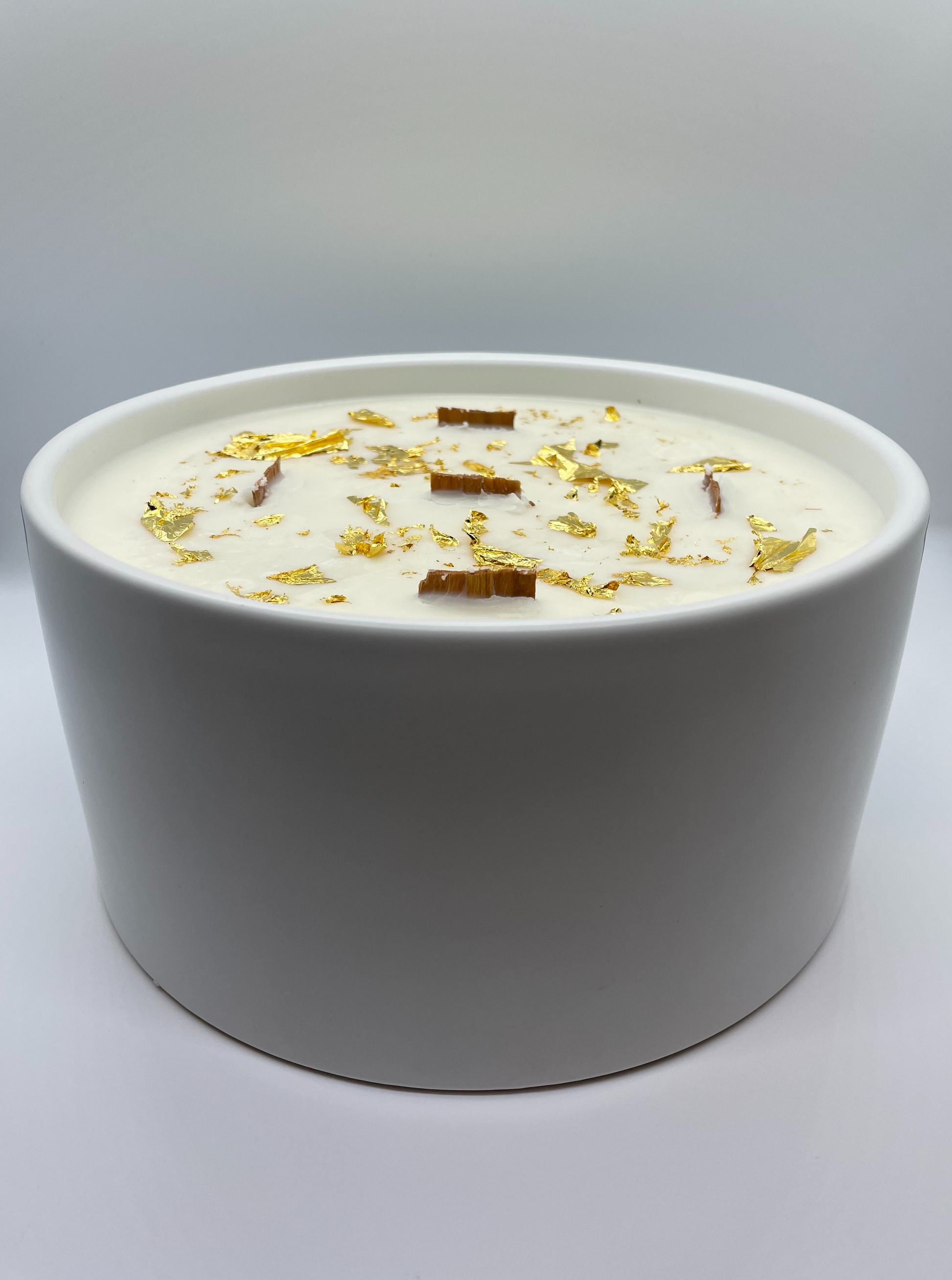 This candle is a game changer. We have always said we use the best materials we can find on the market and we wanted to prove it. We took our candles, multiplied them, and poured 77 ounces into a beautiful 8" ceramic vessel and topped it off with actual 24k gold.