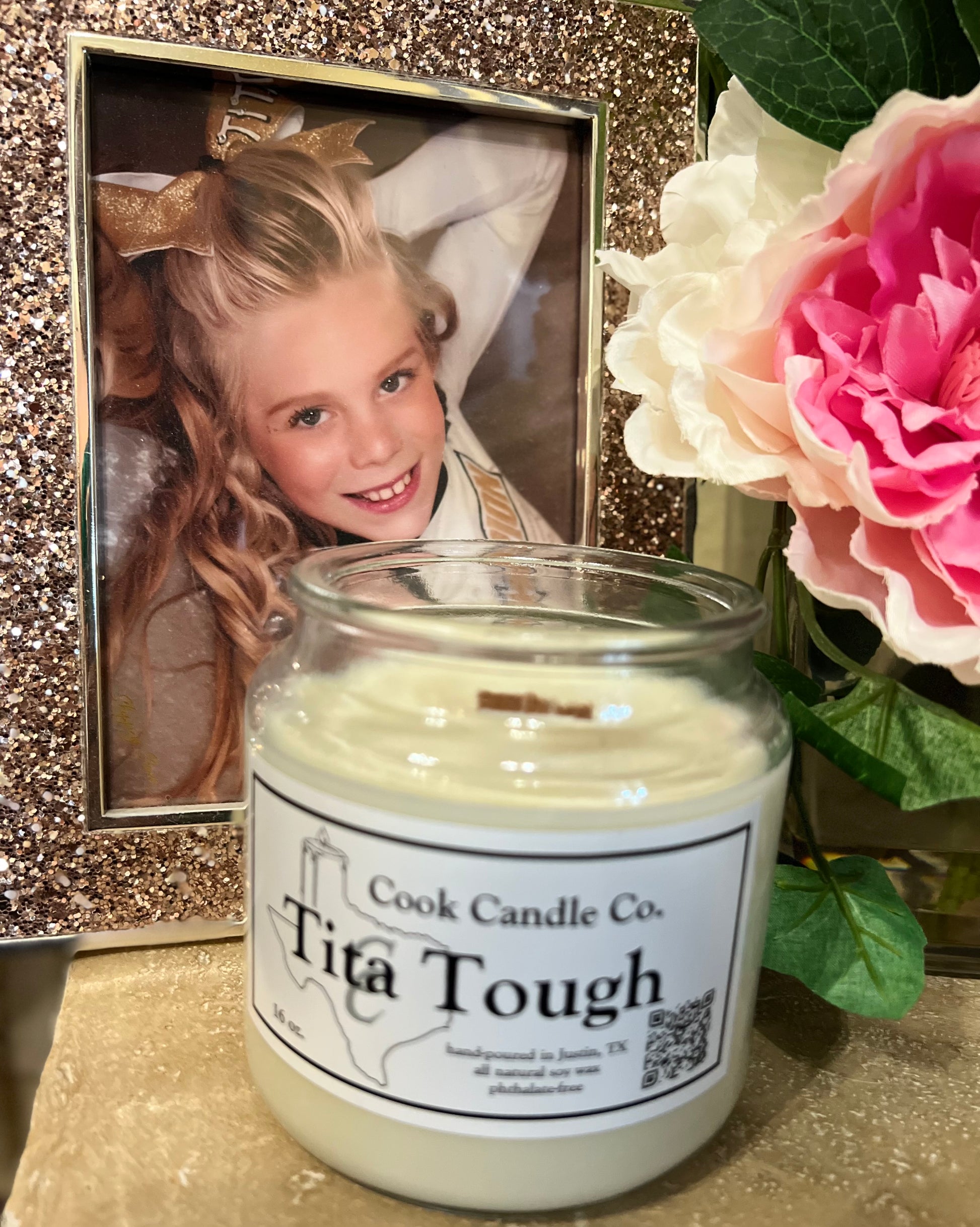 This candle is very near and dear to our hearts. The Tita Tough candle is meant to honor our dear friends Emma and Tita Shaffer who lost their lives in a car accident where they were struck by another vehicle. The oncoming driver was texting and driving. The fragrance for this candle is the favorite scent that Emma kept around her house: Gardenia Lily.